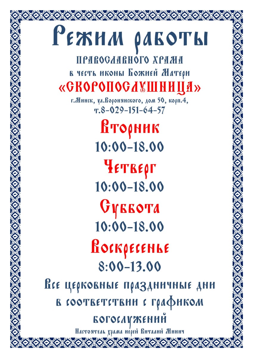 Настоятель прихода в честь иконы Божией Матери «Скоропослушница» в г.Минске — иерей Виталий Минич.